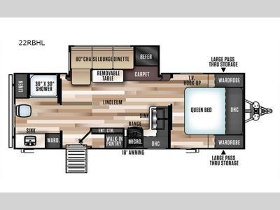 Each model is built with laminated "Aluma Frame" sidewalls and floor with block foam insulation for added durability. There is a power tongue jack with an LED docking light, along with an outside shower, and an extra large pass-thru storage for camp gear. You'll also enjoy the included Elevated Value Package that features conveniences such as square windows with built-in shades, 60K BTU On-Demand tankless water heater, and Maxxis radial tires.