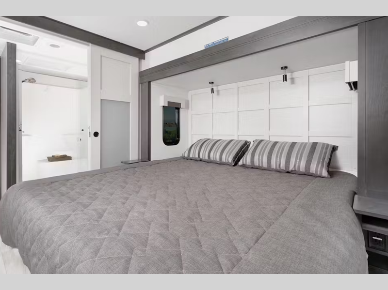 Sleeps 4 Slides 3 Length 37 ft 3 in Ext Width 8 ft 4 in Ext Height 13 ft 3 in Interior Color Lodge, Dovetail Exterior Color Blue Slate Full Body Paint, Copper Mist, Frost Black Hitch Weight 2560 lbs Dry Weight 13585 lbs Cargo Capacity 2915 lbs Fresh Water Capacity 75 gals Grey Water Capacity 83 gals Black Water Capacity 49 gals Tire Size 215/75R17.5H Furnace BTU 35000 btu Available Beds King Refrigerator Type Residential with Ice Maker Refrigerator Size 18 cu ft Convection Cooking Yes Cooktop Burners 3 Number of Awnings 2 Axle Weight 7000 lbs LP Tank Capacity 30 lbs Water Heater Type On Demand AC BTU 46500 btu TV Info LR 50" LED TV, BR Smart HDTV Awning Info 10' and 11' Carefree with Adjustable Arms Axle Count 2 Washer/Dryer Available Yes Number of LP Tanks 2 Shower Type Shower w/Seat Electrical Service 50 amp Similar Floorplans