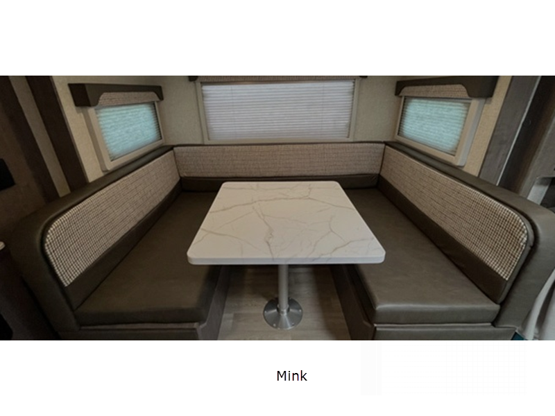 Each model is constructed with thermopane Euro windows, a molded fiberglass front cap, and Azdel interior panel walls for durability. There is Lite-Ply cabinet construction inside, along with Surf-X suedo solid surface lightweight countertops and tables, decorative backsplash, and many more interior comforts. Outside, the Keyed-Alike storage compartment doors will keep your gear secure and the exterior wash station will make it easy to wash off camp gear.